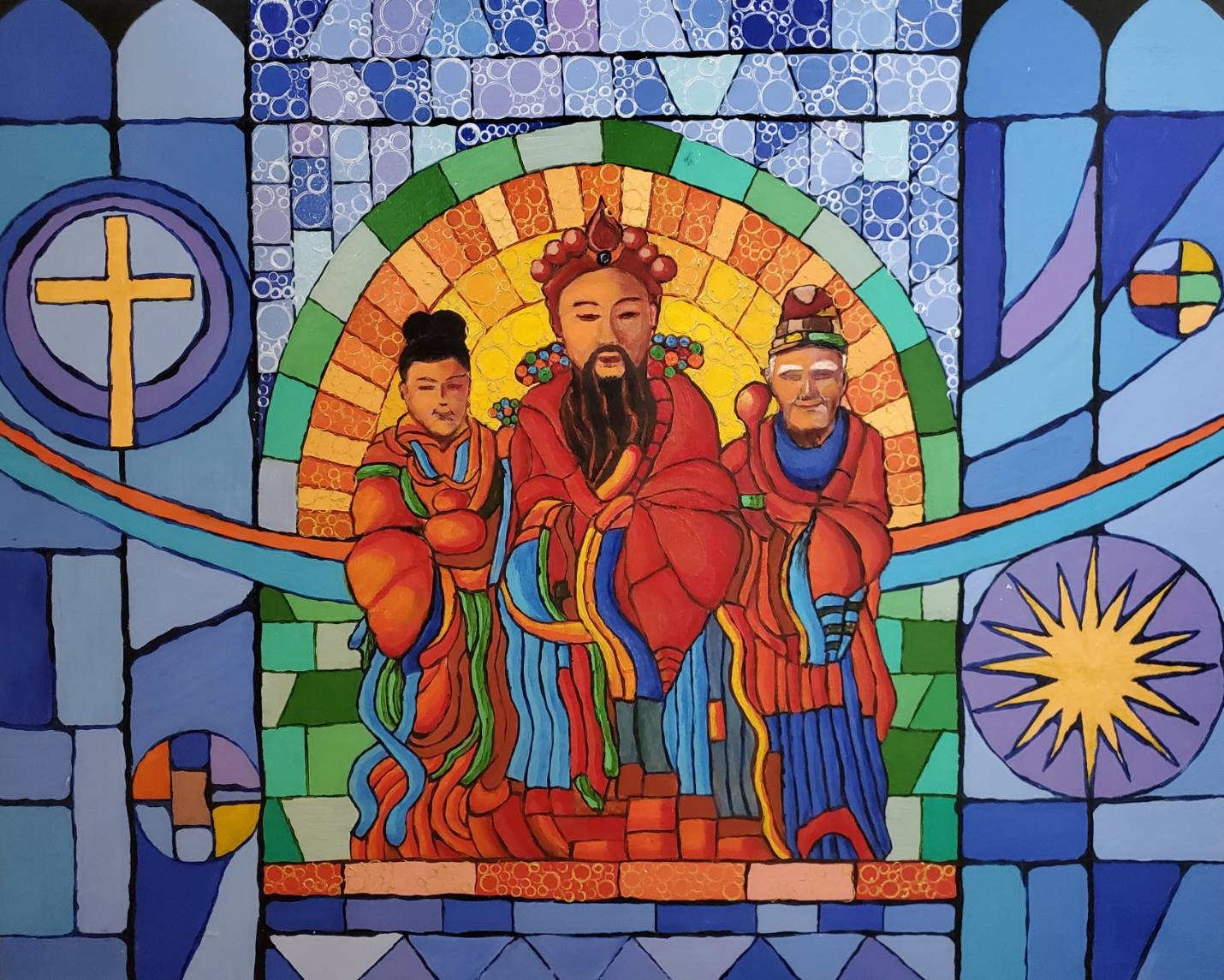 北港朝天宮的天官剪黏,混搭哥德式教堂的彩繪玻璃, 呈現東、西方宗教的視覺融合