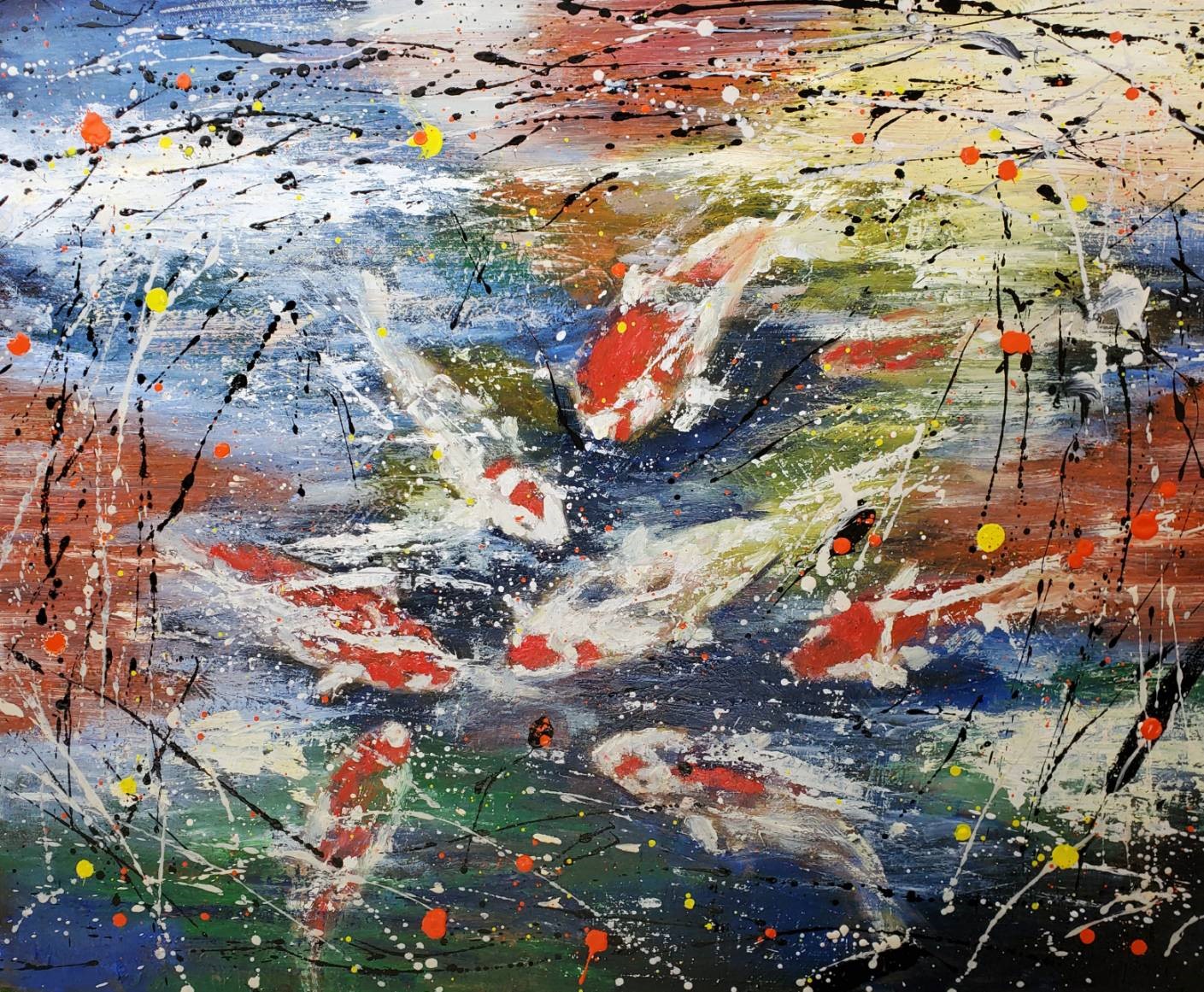 將具象鯉魚與抽象水花『混搭』,以岸上燈光投影,增加水面的多元色彩, 再以滴灑法,表現飛濺水花的自由、張力與狂野