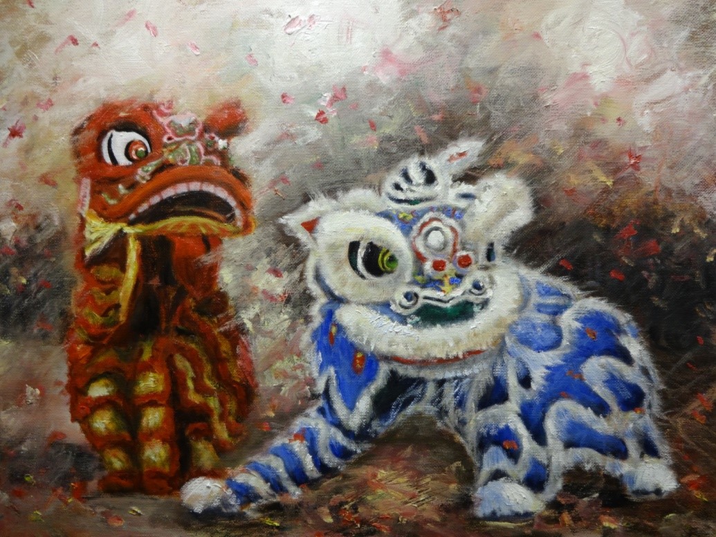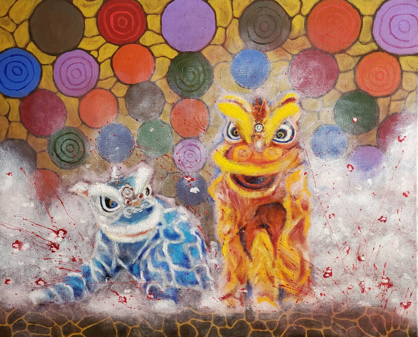 從彩繪玻璃聯想到宗廟中串串連結的燈籠,再延伸到廟會熱鬧的舞獅慶典,本作品以傳統粗曠的舞獅爆竹,與彩繪玻璃風格的燈籠背景進行混搭,揉合傳統與創新的表現形式,塑造具有節慶特色的裝飾藝術。