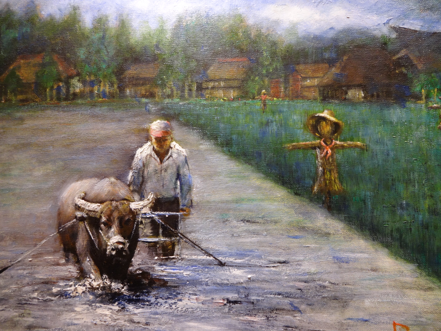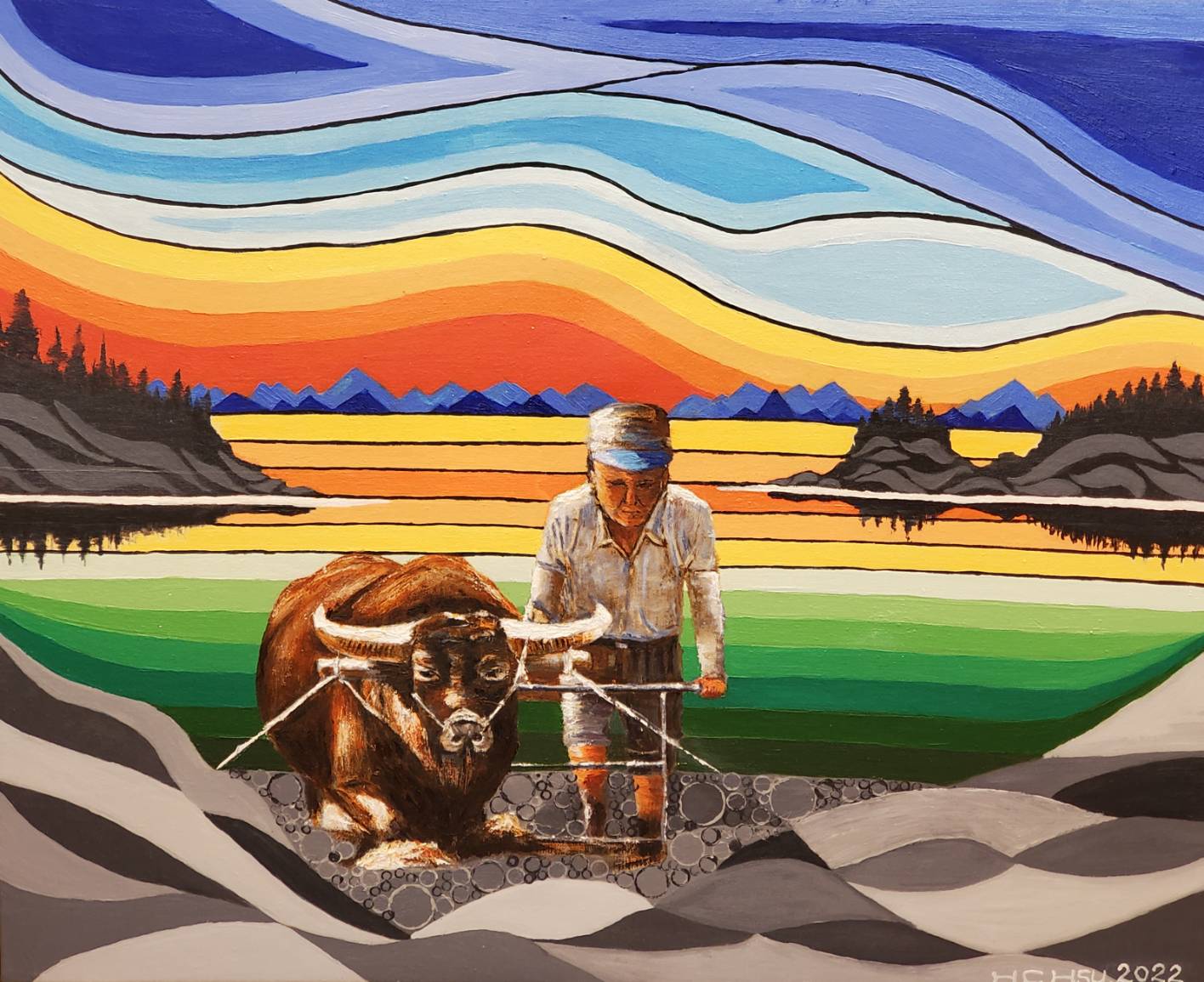 本作品以厚塗寫實的水牛與農夫,與平塗多彩的水梯田色塊背景進行混搭,表現傳統與當代圖像的衝突美感。