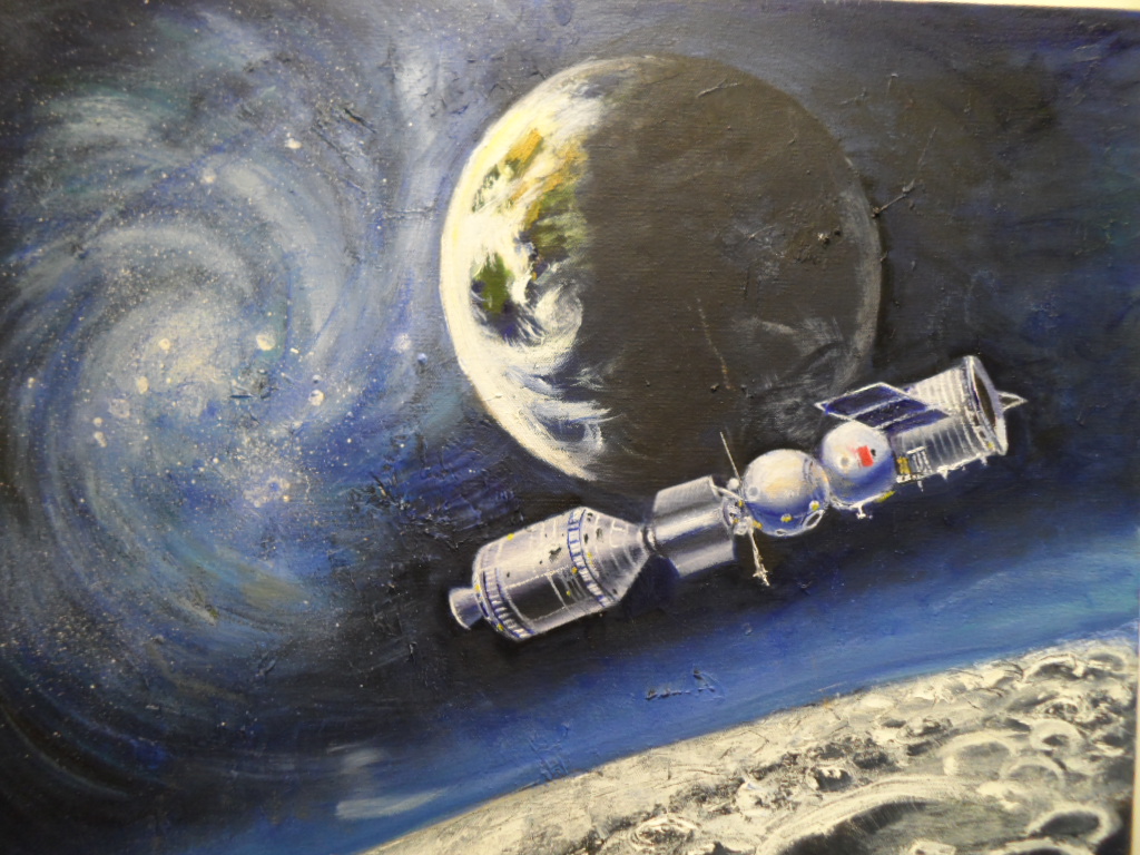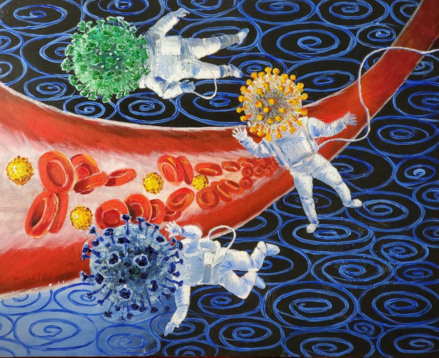 我們對於新冠病毒的未知與鑽研,就如同人類自古對於太空宇宙的聯想和探索,畫面結構以血管穿透太空人的三角對稱,將立體具像與平面圖騰融合呈現。
