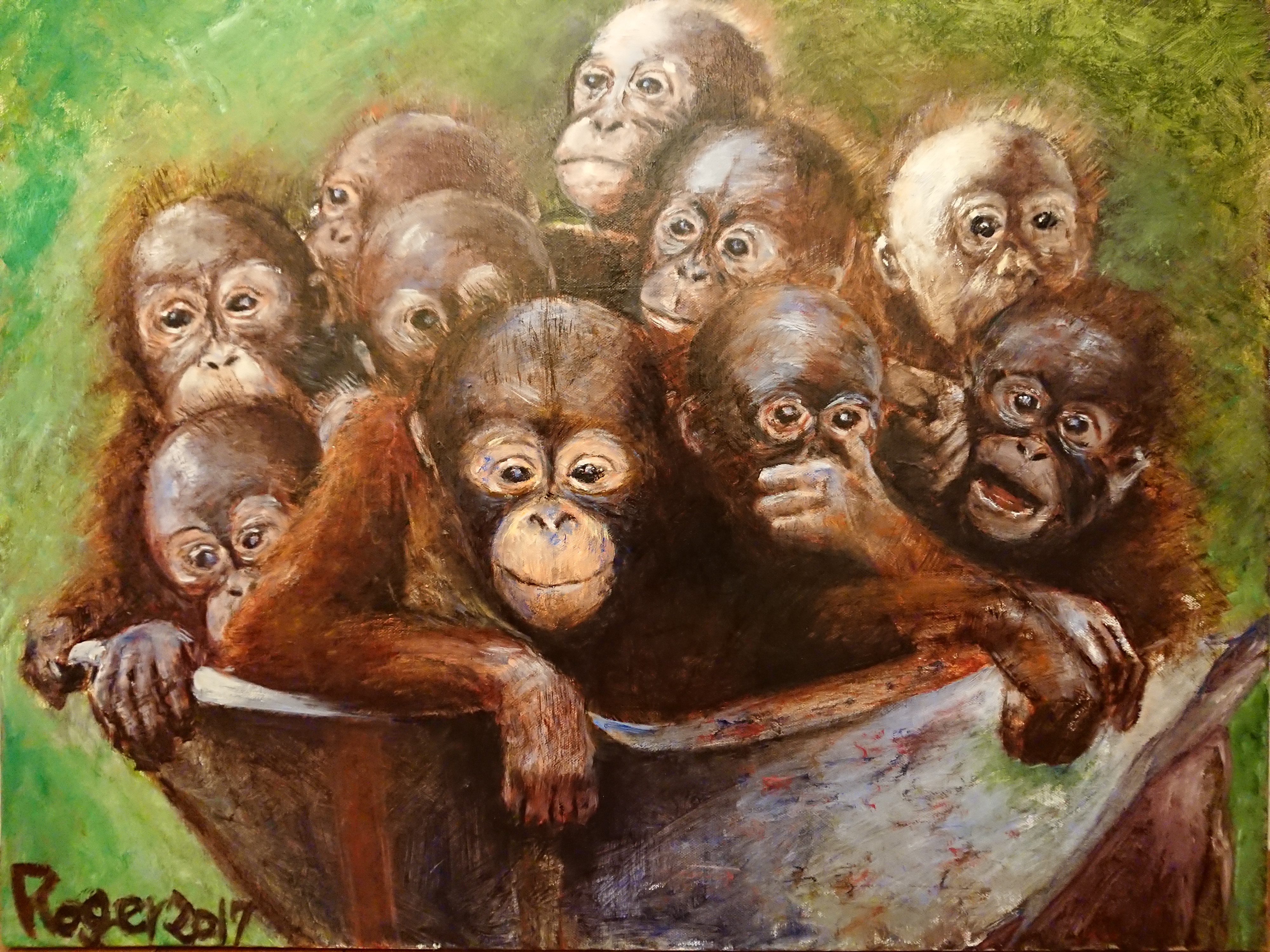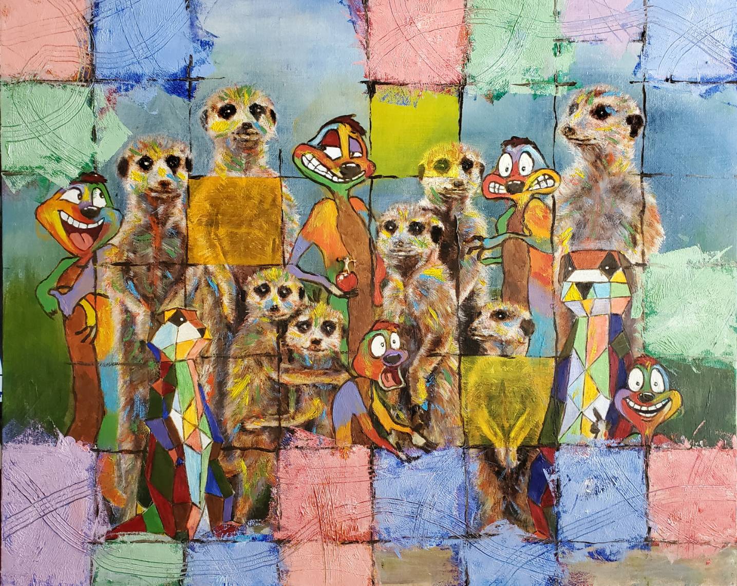 陽光穿透過鑲著彩繪玻璃的鐵籠,照射在籠內狐獴身上,化身成為七彩的卡漫狐獴與立體狐獴,將平面與立體混搭,具象與非具象融合,再穿插實體公仔,以裝飾藝術的風格表現在畫布上。