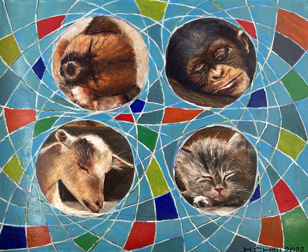 本作品以寫實動物的夢境,與彩繪玻璃風格的捕夢網背景進行混搭,創造色彩繽紛的美麗夢境。