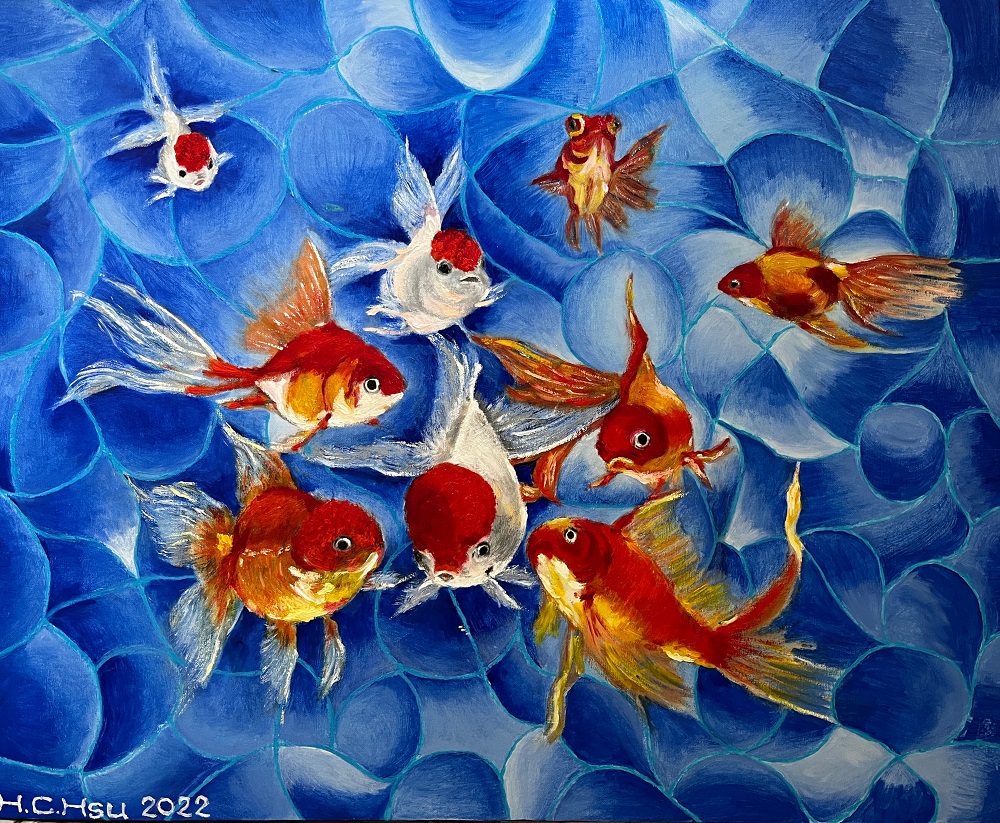 本作品以傳統寫實的金魚群游,與彩繪玻璃風格的水波紋背景進行混搭,紅藍白相間的色彩融合,表現法式彩繪玻璃裝飾藝術的特殊風味。