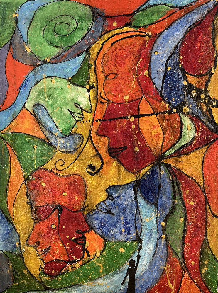 本作品透過滾輪厚刷的多彩底圖,及花嘴滴流的女人線條,以類似彩繪玻璃的鑲嵌花窗構圖,呈現多層次的抽象視覺表現。