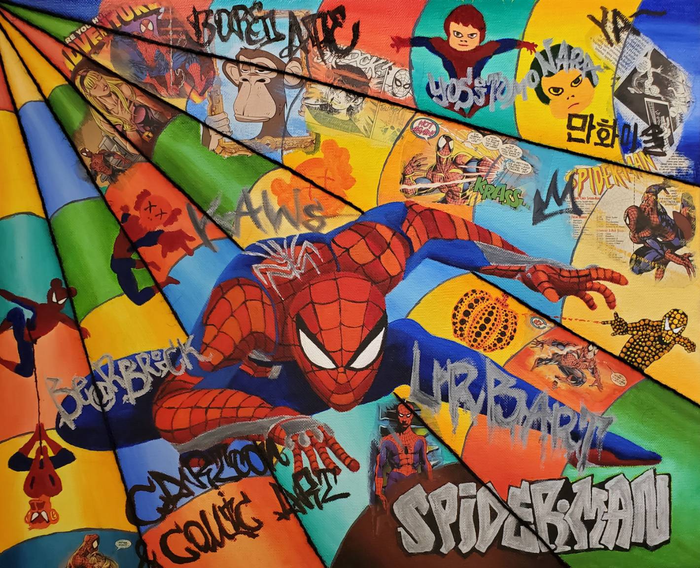 本作品將主題蜘蛛人及背景蜘蛛網,與彩繪玻璃結合,穿插蜘蛛人漫畫、毛線蜘蛛網的複合媒材拼貼,以及奈良美智、KAWS、草間彌生、庫柏力克熊、無聊猿的趣味卡漫插圖,繽紛多彩的視覺享受,表現新世代的美學力量。