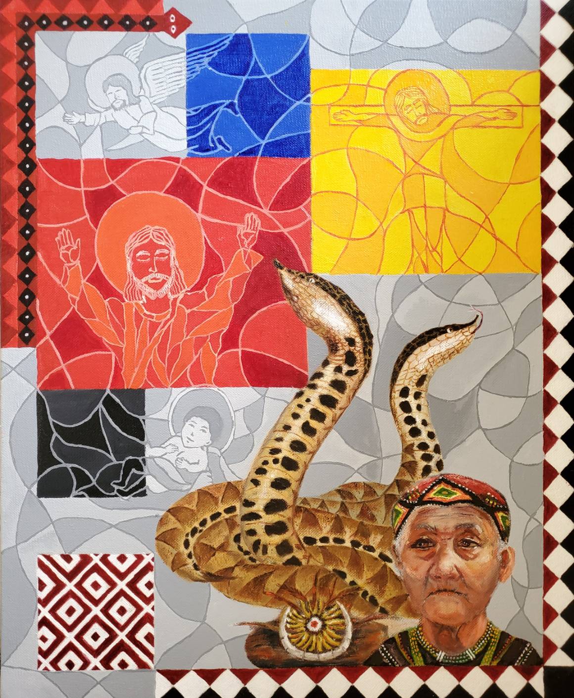 排灣族、百步蛇、基督教的三角矛盾故事,透過新造型主義蒙德里安(Piet Mondrian)紅黃藍格子畫,以及彩繪玻璃色塊的背景襯托,將原民文化與基督信仰彼此深化,相互融合。