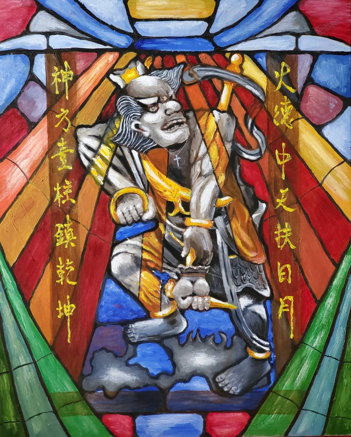 本作品將立體神明圖像『混搭』平面彩繪玻璃,中西宗教風格融合為一,將東方神明以彩繪玻璃的形式呈現。